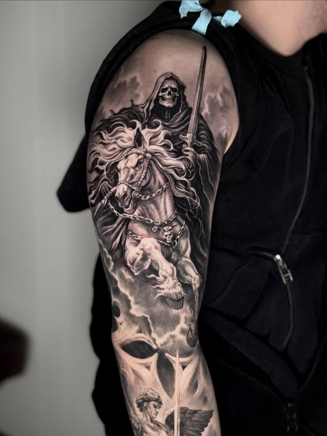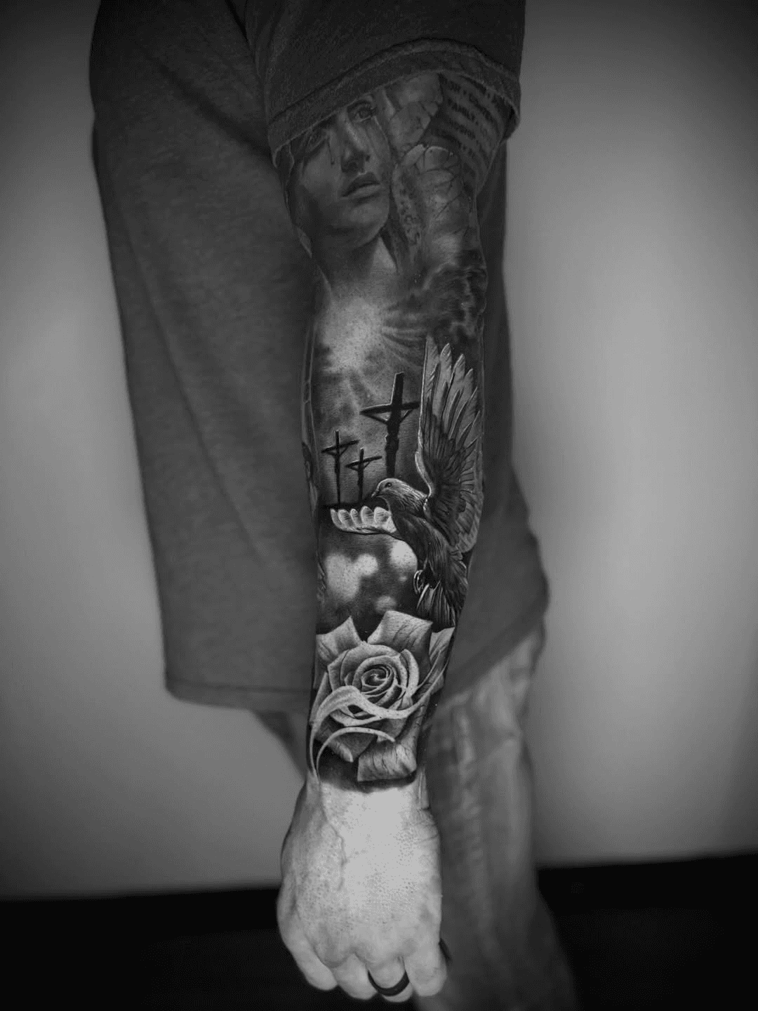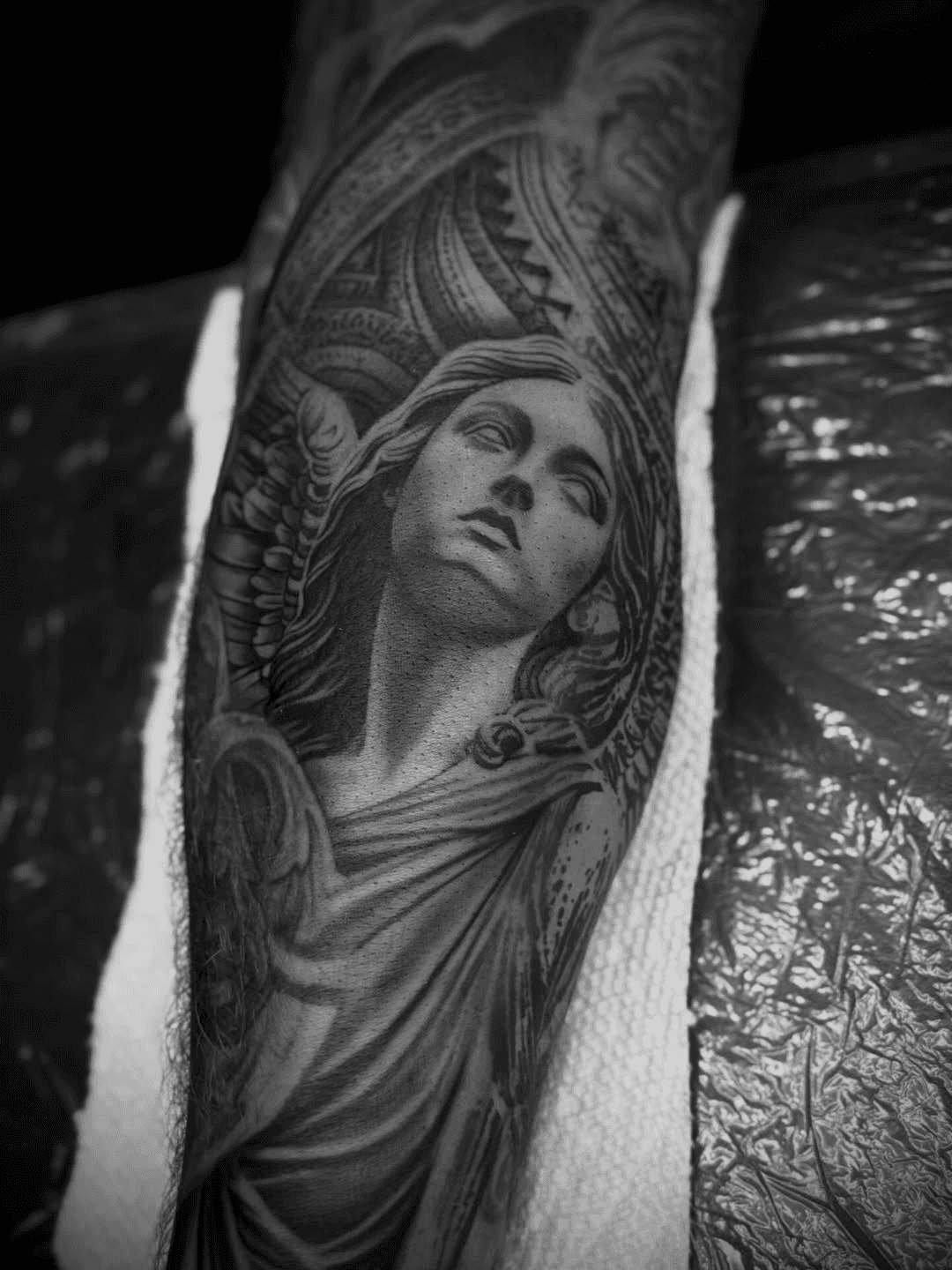 There's not a ton of really good black & gray realism artists in my area to choose from who I thought could do my vision of what I wanted justice, and I ended up finding out about A.J. Harber from Mystic Images in Noblesville, Indiana. I couldn't have been any happier with the result. Hopefully you guys enjoy the outcome of it as much as I do. <3