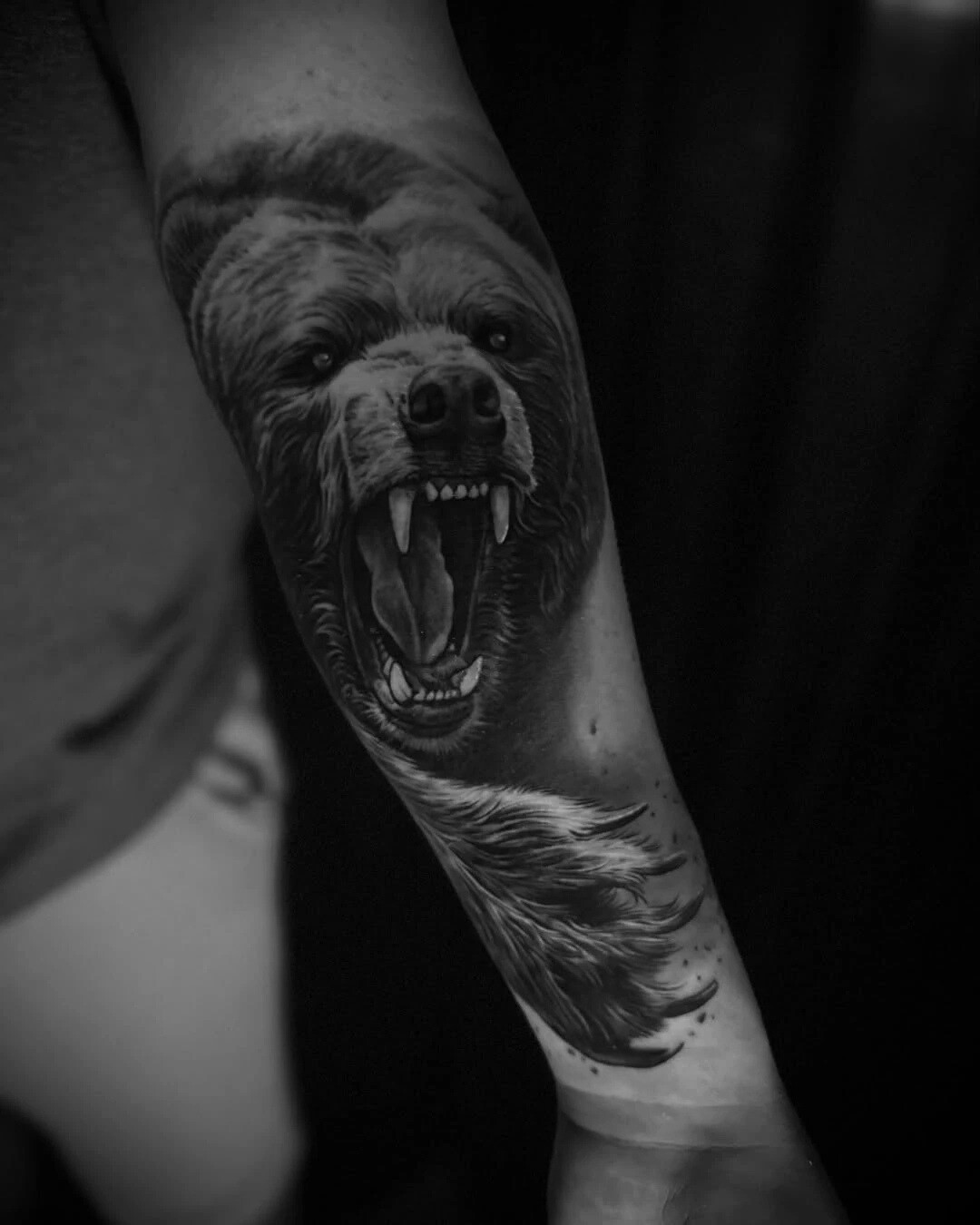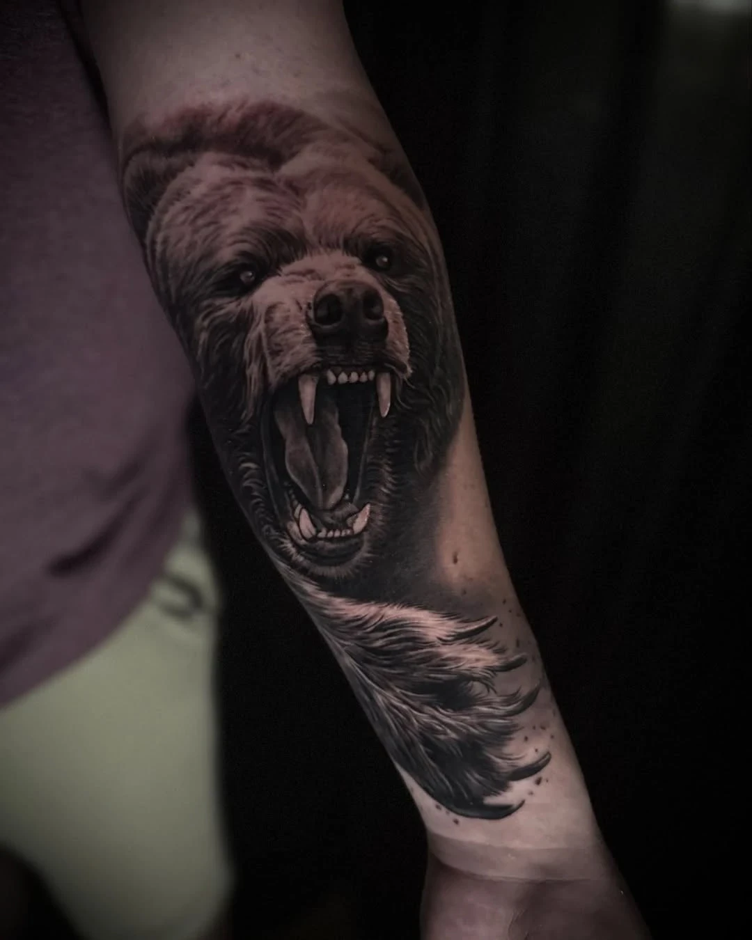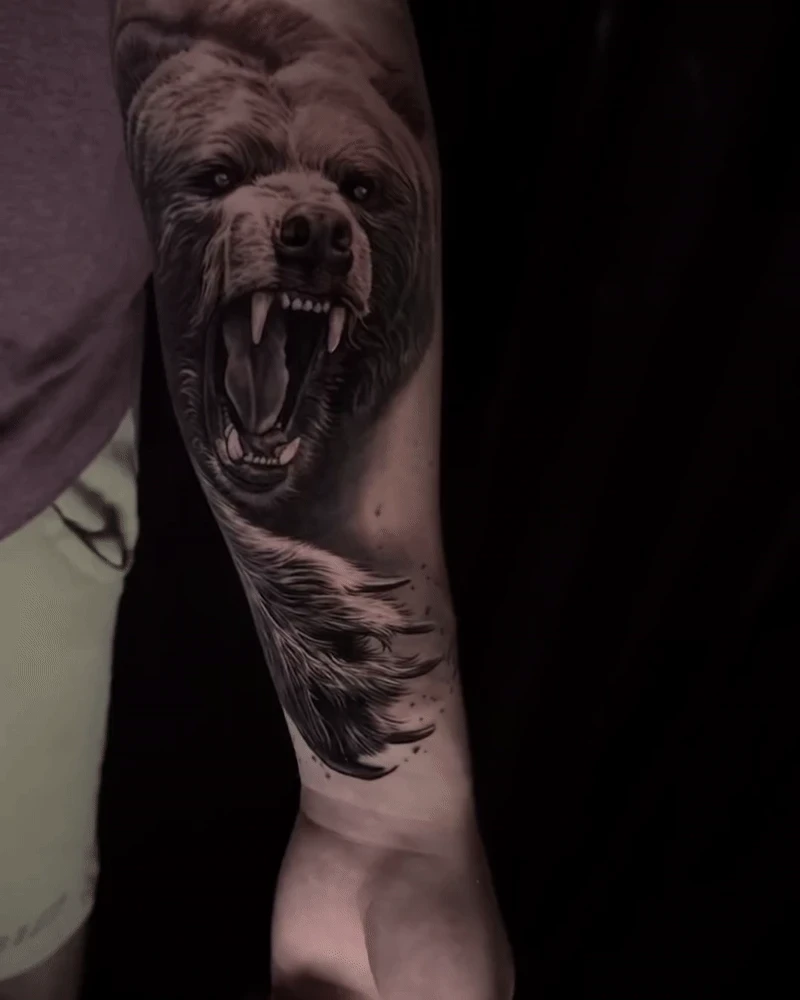 This piece marks the first session of a full sleeve — a roaring bear, mid-snarl, frozen in raw defiance. Every strand of fur and shadow was built to channel its primal power. We layered contrast slowly, giving the fur lifelike texture and depth. At the wrist, it fades softly, hinting at the elements still to come. It’s more than ink — it’s a story of strength, instinct, and survival. And this is just the beginning.