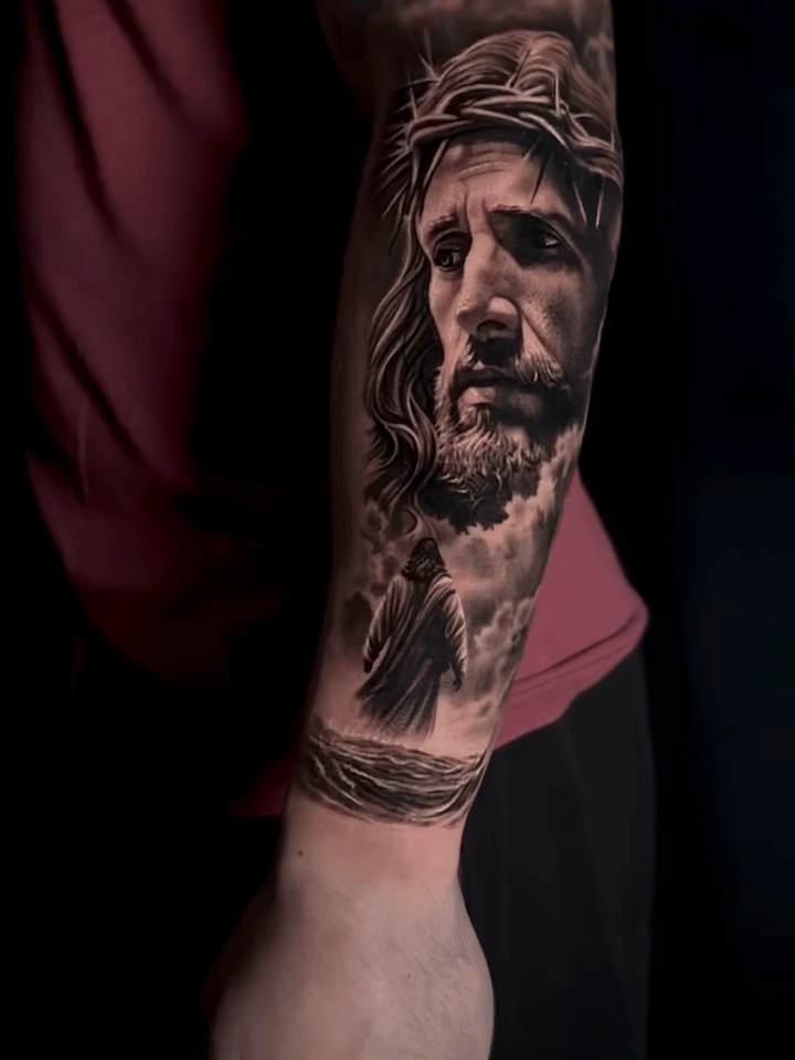 A deeply emotive black-and-grey piece depicting Christ crowned with thorns, capturing sorrow, sacrifice, and unwavering compassion.