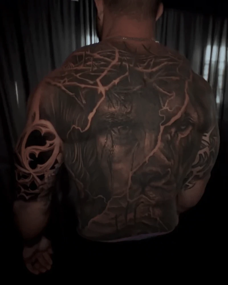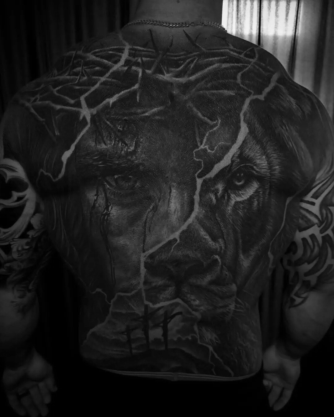 This full back piece, "Crowned in Thunder," fuses divine strength and sacred suffering. One side shows a lion’s fierce, guarding gaze; the other, Christ’s anguished face beneath a crown of thorns.
