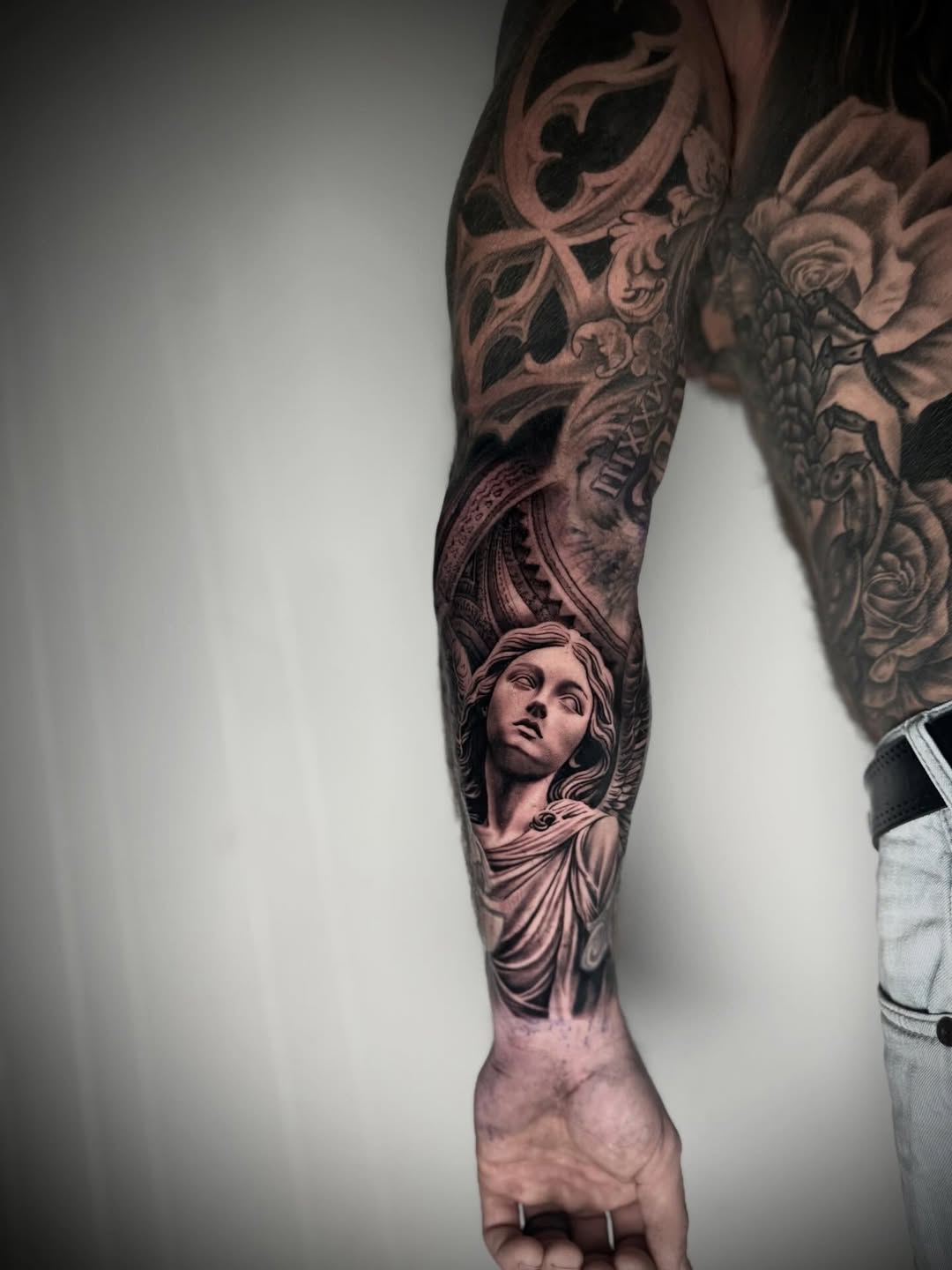 The surrounding elements carry the real pressure. Architecture, texture, and shadow close in around her, framing the figure without overwhelming it. The shading is intentionally restrained, layered slow and tight so it settles into the skin and ages with it, not against it. This wasn’t about filling space. It was about giving the arm a focal point that feels permanent, like it was always meant to be there.